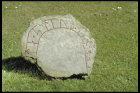 Runstensfragment, 0,74 x 0,65 x 0,09 m med runristningen i en båge. Runornas höjd är 11 cm. Enligt Ölands runinskrifter (Öl 11) lyder inskriptionen:"N. N. reste denna sten efter ... te, sin styfson." Det enkla ordet stjúpr är inte tidigare anträffat i något svenskt literaturminnesmärke. Uppmålad 1987. Alldeles bredvid finns en kalkstensflisa med ristning, 0,47x0,22x0,1 m. Den ena sidan av stenen ...