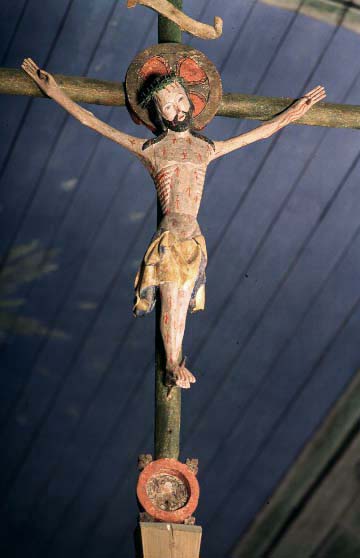 • * krucifixets placering omöjliggör materialbestämning och mätning men Kristusbilden är betydligt mindre än naturlig kroppsstorlek