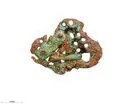 • Genombrutet bronsspänne, slitet och lagat och svårbestämt till formen, ett textilfragment iform av tuskäftad vävnad