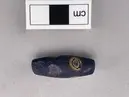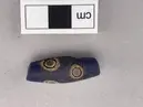• blå, avlång, spolformig pärla med inläggningar av färgade rundlar i vitt och gult