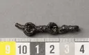• Platt beslag med två gångjärnsliknande öglor/hål samt en trådögla i ena änden. Knäppe? Lekare?
