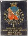 Järnplåt i två delar, h: 600 mm och 425 mm, nitade med 30 mm:s överlappning. Vid övre hörnen två fyrkantiga hål för upphängning. Baksidan målad med brun färg. Framsidan målad med svart färg, därpå målat vapen krönt av svensk kronprinskrona, fyrstyckad sköld: tre kronor, norska lejonet, Folkungalejonet och Upplands riksäpple. Hjärtsköld delad av Vasa och Bernadotte. Runt skölden hänger kedjor och...