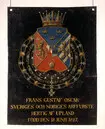 Järnplåt i två delar, h: 600 mm och 425 mm, nitade med 30 mm:s överlappning. Vid övre hörnen två fyrkantiga hål för upphängning. Baksidan målad med brun färg. Framsidan målad med svart färg, därpå målat vapen krönt av svensk kronprinskrona, fyrstyckad sköld: tre kronor, norska lejonet, Folkungalejonet och Upplands riksäpple. Hjärtsköld delad av Vasa och Bernadotte. Runt skölden hänger kedjor och ordenstecken för Serafimer-, Svärds-, Nordstjärne- och Vasaorden. Nertill text med guldfärg: "FRANS GUSTAF OSCAR // SVERIGES OCH NORIGES ARFFURSTE // HERTIG AF UPPLAND // FÖDD DEN18 JUNII 1827".