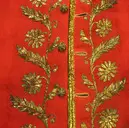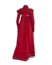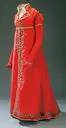 Snittet är typiskt för 1810-talet, varför Josefina troligen medfört kappan vid sin ankomst till Sverige 1823. Fotsid kappa, sydd med två sidsömmar bak med infällda kilar i nedre kanten för att få ut vidden. Kappan är av rött tunt turkiskt ylletyg fodrad med vitt siden. Ett guldbroderi i föreställande en blomsterslinga i vid kanterna av rockens framstycken, nederkant, krage, slag och ärmslut. Kapp...