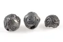 • Två hela och en fragmenterad (halv). Filgranornamentik i form parvis kopplade spiraler. Hålen strakt nötta.
