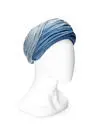 Damhatt, turban, av ljusblå siden. Tyget är dels crepat, dels lagt i större veck som löper i oregelbunden spiral upp mot toppen. Sidenet skiftar mellan mycket ljust blå till något mörkare. Två hattnålar med sidenmaterial.