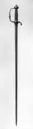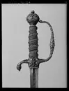 Kavel lindad med tunn, blånerad ståltråd med breda partier av kedjeliknande mässingstråd med tunnare mässingstråd på båda sidor. På de blånerade partierna en vriden koppartråd. Kaveln upptill och nedtill avgränsad av flätade kransar av koppartråd. Kryss h: 32 mm, på utsidan dekor i form av en knästående skytt omgiven av en hund och blommor, på insidan en lyrspelande Orfevs med vildsvin, apa, varg och björn. Kryssbygel med dekor av slingrande blad och blommor samt mitt för krysset något ansvälld med en liggande hjort. Kort bakre parerstång, nedåtböjd med blad och rankor samt på insidan en fågel, på utsidan en hare. Den främre parerstången ut- och uppdragen i en främre handbygel med dekor av blad- och blomrankor samt mittpå något ansvälld med en sittande människofigur på var sida.