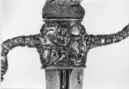 Fäste av stål med snidad reliefdekor mot förgylld botten. Nitknapp plan ovantill, nedtill med bladkrans. Stor knapp med dekor i form av människofigurer på ut- och insidan samt slingor och bladornament.