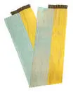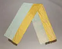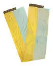 Axelskärp som knytits i stor rosett på höften. Skärpet är ihopsytt i mitten med en längsgående sömdär sömsmånerna vikts in så att den blå ligger över den gula sidan. Det gula sidenet är kraftigareän det blå.