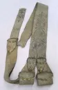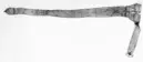 Beigefärgat gehäng av älghud. En remdel som övergår i två delar vars ändar spännes upp på baksidan så att kanaler bildas. Spännes med molnformade söjlor i gul metall, troligen mässing, med prickad dekorlinje runt om. Enligt gula liggaren i förgylld mässing. Fem söljor totalt. Remmens tre kortändar skodda med spetsiga metallplattor i gul metall dekorerade med prickade linjer i olika mönster.