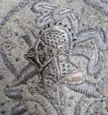 Broderi på remdelen i plattsöm, med guld- och silkestråd samt paljetter. Motiv i form av växtslingor samt en hjälm i profil med visir, med en sabel och plymer bakom.