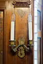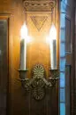 LAMPETTER, 4 st av förgylld brons. Tvåarmade. Gjutna och ciselerade. Varje bestående av ett avlångt väggstycke i dess mitt en rund tjock bladrosett från vilken uppåt och nedåt utgår ett genombrutet palmettornament. Lampetterna monterade för elektriskt ljus. Inköpta på auktion hos konsthandlaren H Bukowski, Stockholm