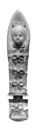 Dekor i färger på glasyren. Framtill goffrerad vit mössa med ett tvärgående smalt rödgredelint band samt rödbruna hak- och nackrosetter . Barnet liggande i en rödgredelin s.k. liggkudde, glest lindad med vita band samt framtill med fyra gröna rosetter. Fotändan som skjutlock. Mynningsbeslag av mässing, släta.