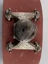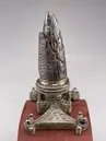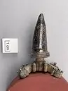 Praktsporre av järn med X-formig fästeplatta med nitar i hörnen. Plattorna är klädda med sillverbleck med dekor av kantföljande pärltråd och cirklar mitten. I mitten och i hörnen sitter dekorativa silvernithuvuden. Själva piggen till sporren är konisk och avslutas nedtill med pärlstavsbårder. Finns även rester av inläggningar av Cu-legering . På ena sidan av piggen sitter ett silverbleck med rutmönster.Stäng
