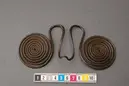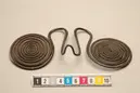 • Glasögonformat smycke/spänne av spirallagd bronstråd med rombiskt tvärsnitt. Kraftigt nött på ena sidan.