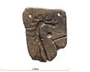 • Ena halvan av en gjutform, sannolikt avsedd för att gjuta dräktnålar i överfångsteknik med silver eller brons på järn.
