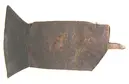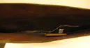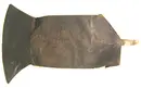 Benläder av svart läder, formsytt efter vaden med en baksöm. I nederkanten sitter en hälla av svart läder. Benlädret har en vid krage.