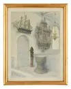 • Björnlanda, Bohuslän, 1929. Ferdinand Bobergs avbildningar av svenska kyrkointeriörer utförda i kol och färg av F. Boberg, ramade i förgyllda trälister (535x420 mm)