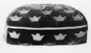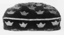 Halvcirkelformad, hårt stoppad dyna av blå, grov linnelärft, ihoptråcklad med ofärgat snöre. På ovansidan samt på den raka kortänden klädd med blå sammet. Kantband av guldgalon längs främre kanten upptill samt kortändarna, bredd: 11 mm. Sammetsdelarna dekorerade med strödda, öppna kronor i applikationsbroderi av guld- och silvertråd samt guld- och silverlan. Kronorna har ädelstensimitationer av la...