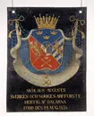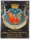 Framsidan målad med svart färg, därpå målat vapen krönt av svensk hertigkrona, fyrstyckad sköld: trekronor, norska lejonet, Folkungalejonet och Dalarnas korsade pilar och krona (NB fältet dock rött i stället för blått). Hjärtsköld delad av...