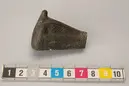 • Längd 4,8 cm, bredd 3,4 cm. Fäst med två nitar. Hål i nacken mellan öronen.