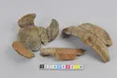 några bitar ihopklistrade;ett lerkärl med öra, profilerat och med plan botten:rött gods