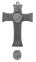 • KRUCIFIX (relikkors) med Benedictus-medalj. Av brons. Korset ihåligt, med rektangulärt tvärsnitt; ändarna något utsvängda. Dekor: I relief (gjuten) samt graverad. Framsidan som lock, fasthållet med en tvärgående falskant utmed fotändan samt en snett utstående (uppåtriktad) tapp vid överändan, inpassad i ett runt hål i kors stammens övre tvärända; på utsidan i fri relief den korsfäste, naken men me... Visa hela