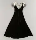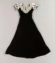 • Hovdräkt av svart silkessammet. Hellång. Avtagen i midjan. Midjelinje med snibbformad avslutning mitt fram. Från midjesömmen utgående bystinsnitt. V-formad ringning fram och bak med fastsydd äldre spets. Gallerärmar av vitt siden, tyll och svarta sammetsband. Foder av siden. Blixtlås i ryggen, längd 400 mm. Ovanför blixtlåset hyska och hake. Längs med bakre midjesömmen invändigt fäst ett 28 mm bre... Visa hela