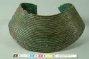 • Framsidan är ornerad med längsgående vulster. Ändarna är delvis avbrutna men visar spår av ornamentik i form av koncentriska cirklar, halvbågar med utdragna spetsar och pärlränder.