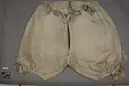 Byxorna, som är rynkade är också sydda av samma tyg som jackan och byxorna. Inte heller här har tygets vådbredd räckt till, ytan man har måst öka ut sidorna med 9 cm breda remsor, även grenen har försetts med smärre triangelformiga kilar. Byxorna består av 4 huvudstycken, som sytts samman med raka sömmar i sidorna, där de 22 cm långa ficksprunden placerats. Sidsömmarnas nedre parti bildar ett 14 c...