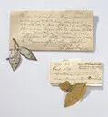 Inlagd i konvolut med påskrift med bläck: "Ett par blad af den krans, som nedlades på Enke Drottning Josefinas likkista den 21 Juni 1876. Det är verkliga blad med en silfverskålla öfwer.