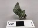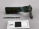 • bandformig fibula med dekor av ränder på båge och fot. Glasögonfibula? Delar av nål och spiral bevarade