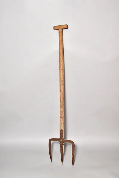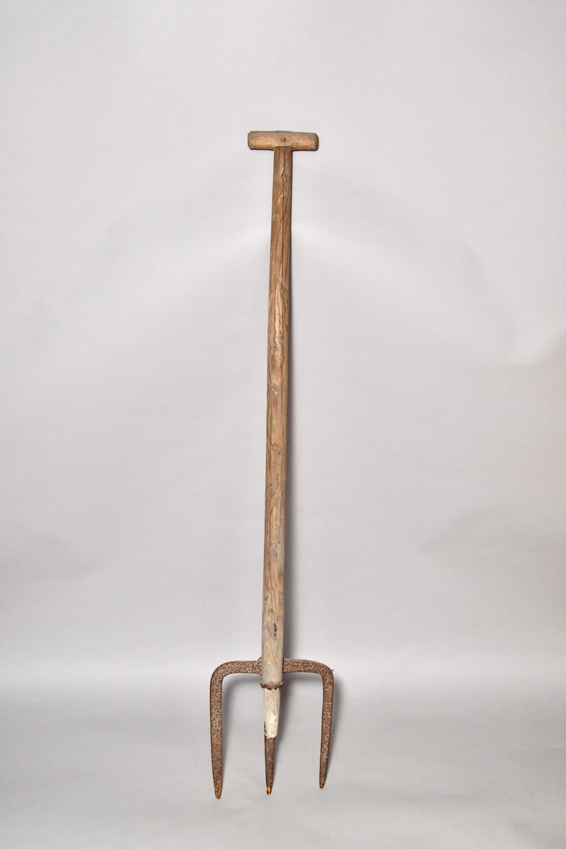• Grep av trä och järn. Trekloig, fäst på skaftet med märla och spik. Tvärställt handtag.