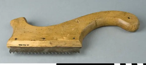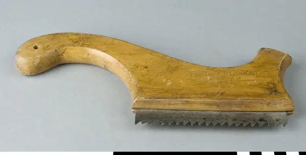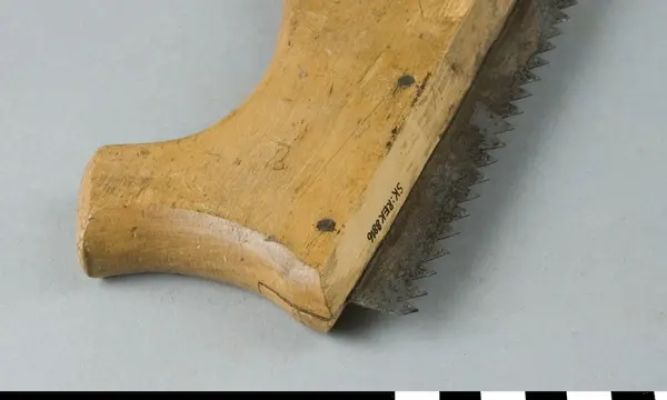 Såg med handtag av bok och sågblad av stål. Bladet är i sin hela längd monterat i handtagets främre del. Bakre delen av handtaget har ett uppborrat hål för upphängning. Handtaget har istämplat firmamärke med text LUNDELL & ZETTERBERG, STOCKHOLM. Används för uppsågning av spår för gradning. Gradning innebär att såga upp kilspår för att få låsning av trästycken vid sammanfogning.