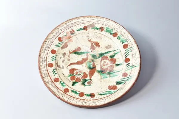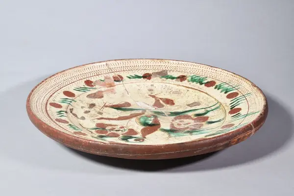 Fat av lergods, lätt skålat, blyglaserat invändigt, engoberat i gulvitt med tulpandekor i brunt och grönt. Utmed kanten hemrad prickdekor. Utvändigt oglaserad. Glasyrbortfall, genomgående spricka.