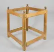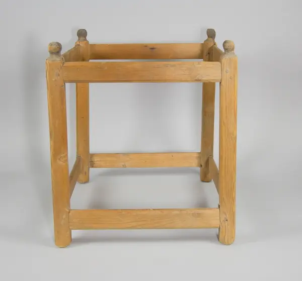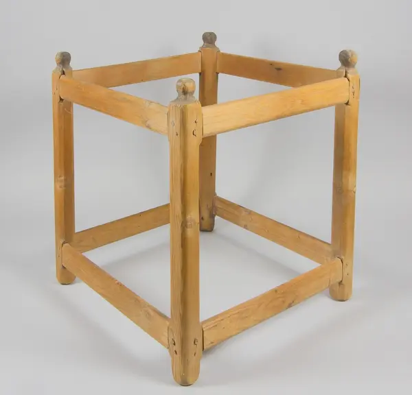 • Ställ för silduk, i furu. Fyra ståndare med svartmålade knoppar, åtta intappade tvärslåar.