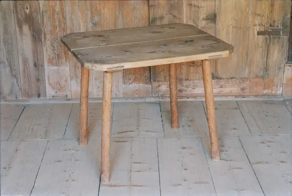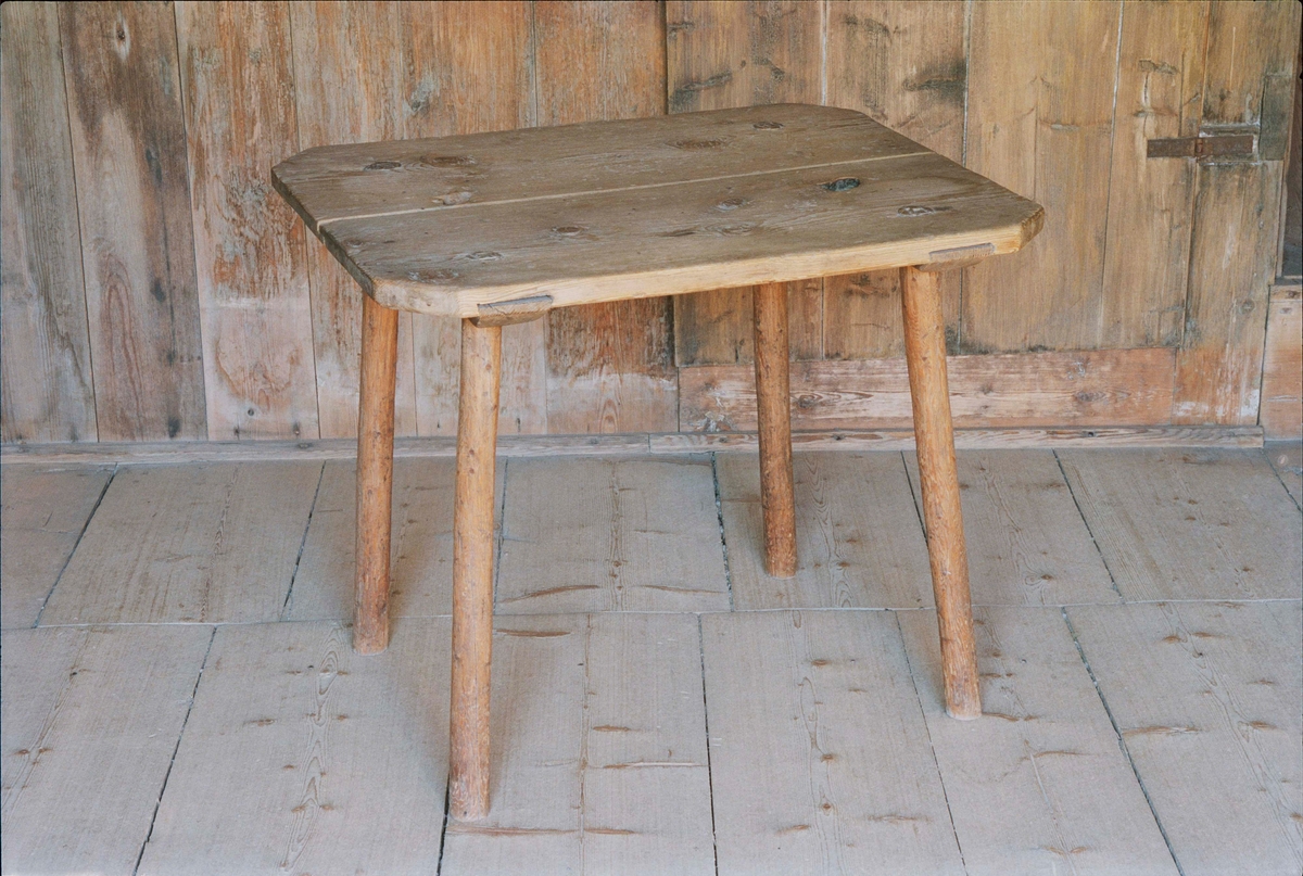 • Bord av omålad furu, fyrsidig skiva av två plankor med avfasade hörn, enkla runda ben