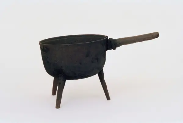 • Gryta av gjutjärn, 3 fötter, ihåligt skaft, avslaget och på nytt påsatt.