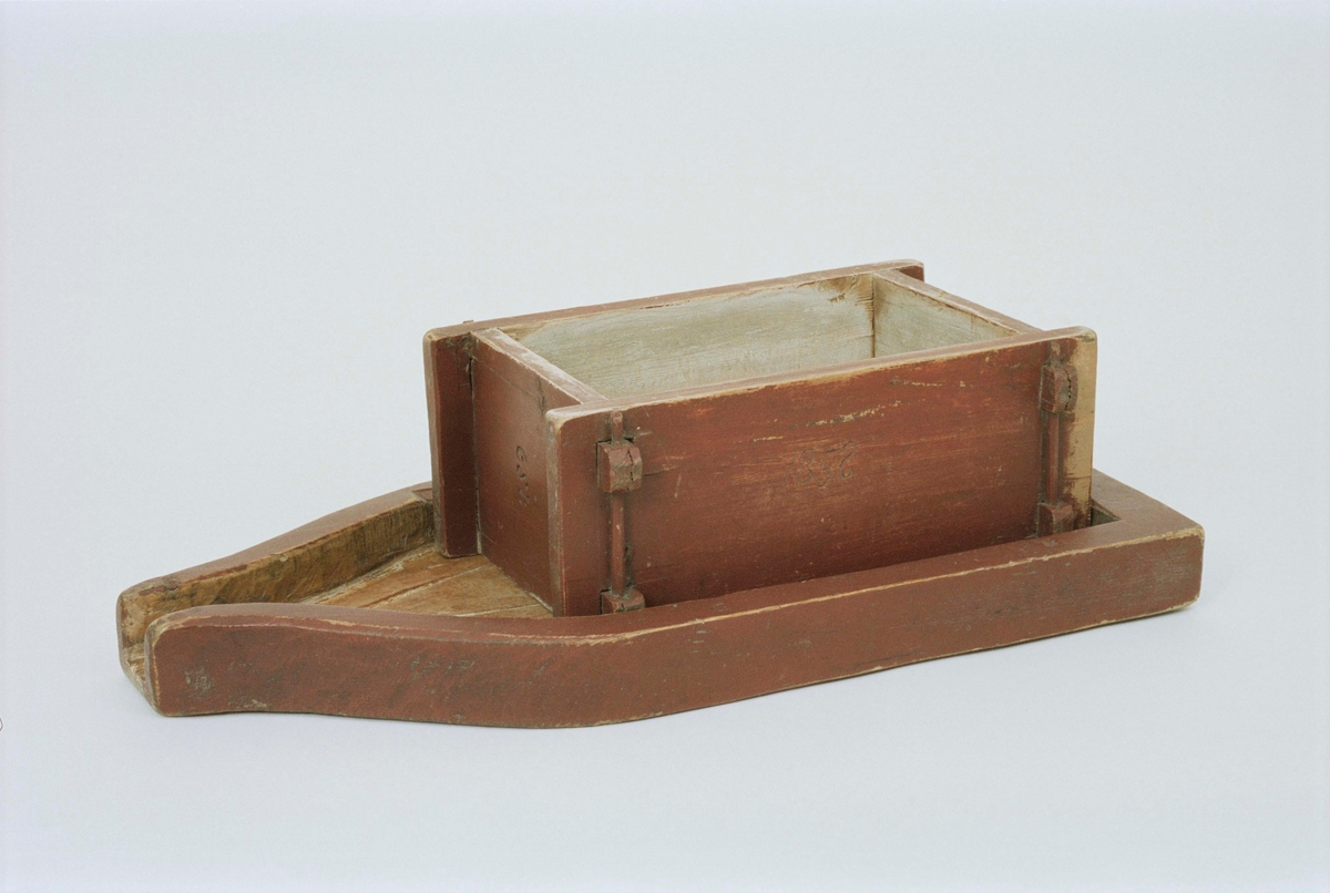 A) Rektangulär ostform utan botten, av lövträ ,målad rödbrun invändigt. Inskuret " C.S.L / 1852 " samt bomärke. B) Ostränna av lövträ, målad rödbrun, rektangulär, avsmalnande vid ena kortsidan med öppning för vasslans avrinning, skurna rännor samt samma bomärke som A.