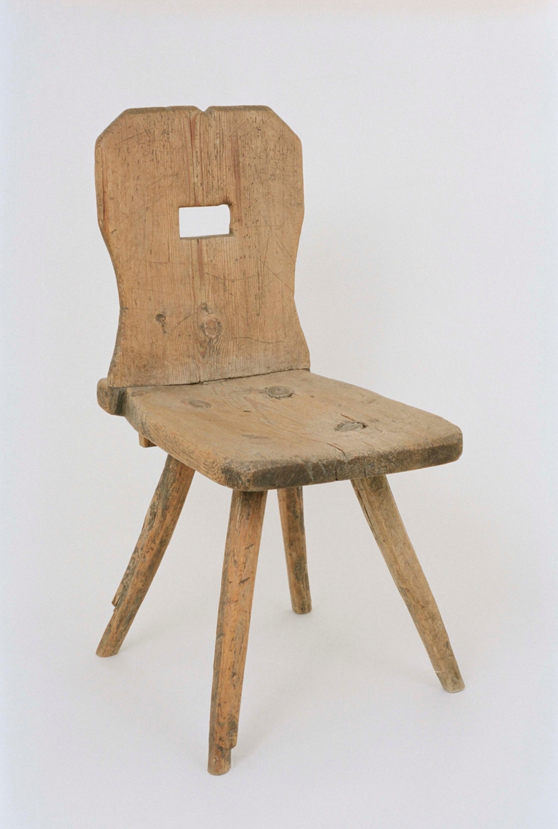 Stol av omålad furu, vertikalt ryggstöd, enkelt profilerat med urtag för handtag, itappad i sitsen med tre tappar. Itappade ben, höger framben av björk, de övriga av furu med barkrester.