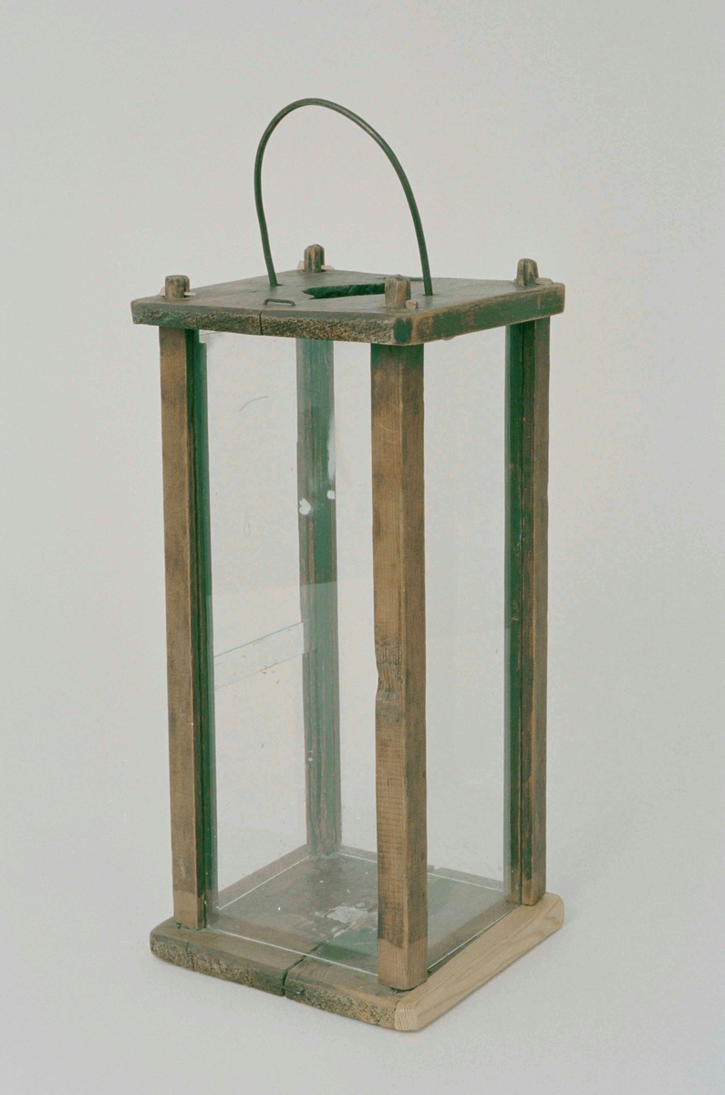 Fyrkantig lykta med hörnstolpar och bottnar av trä,brunbetsad, sidorna av glas. En sida har delad glasskiva, skjutbar i vertikalt läge. Handtag av järn, ljuspipa saknas.