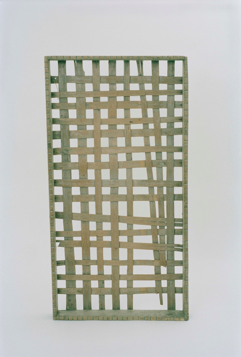 • Rektangulär låda med träram av furu, botten av flätad spån fastspikad på ramen.
