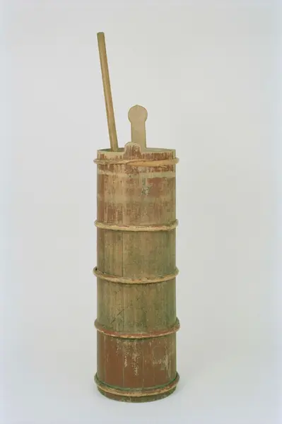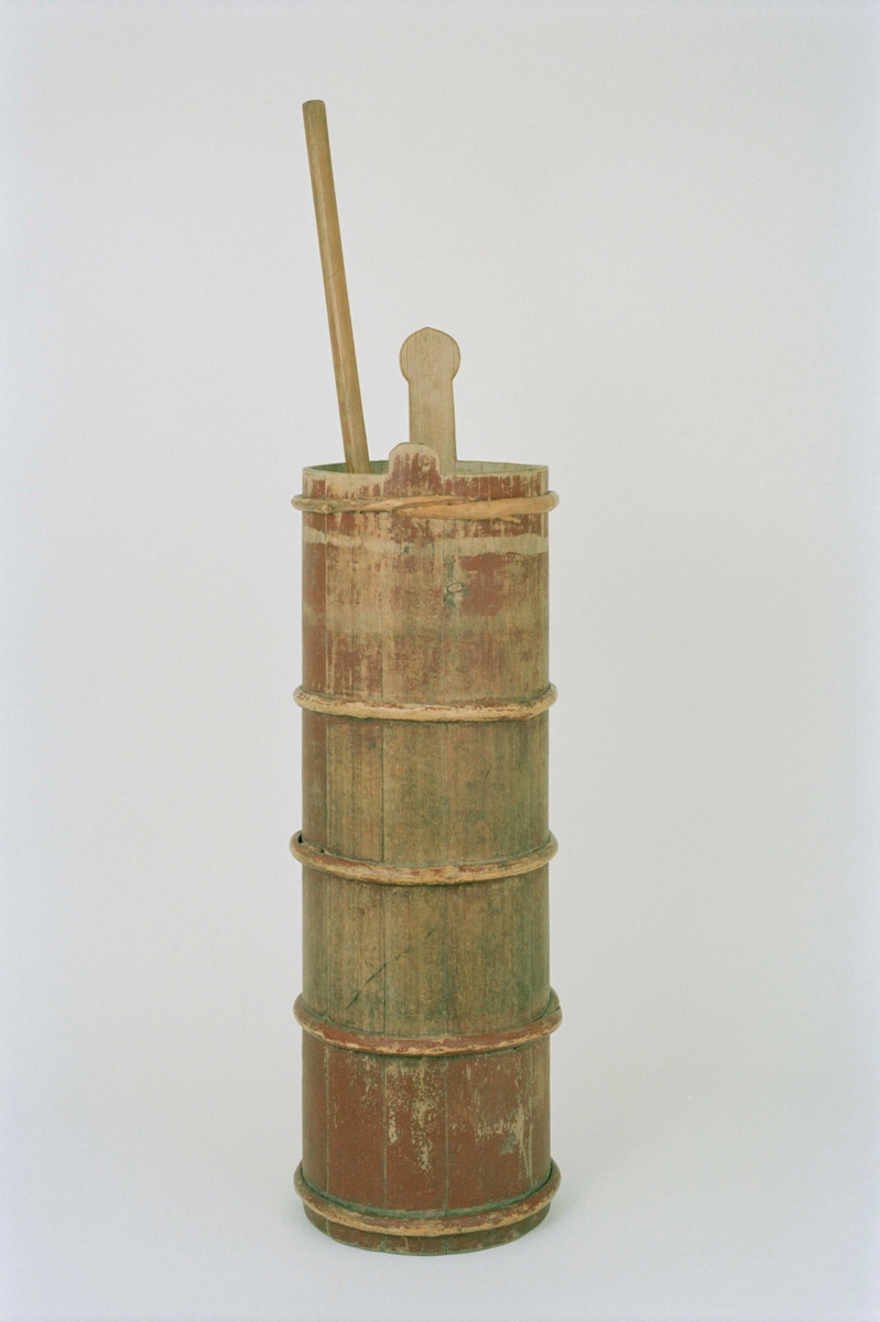 • Smörkärna (a) och kärnstav (b) av trä, laggad med 8 stavar, 5 band. Rödmålad.