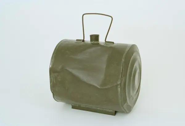 Brännvinskutting av bleckplåt, cylindrisk, liggande på pålödda lister till fötter.Tapphål på ovansidan, handtag av järntråd.