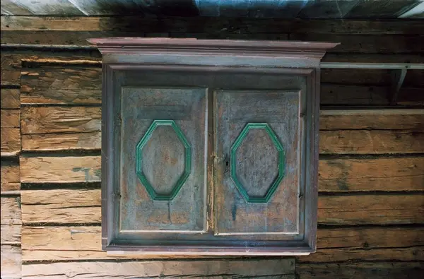 Överdel till skåp, av barrträ, ådermålad i brunt. Rakt profilerat utskjutande krön, två dörrar med 8-kantiga speglar med gröna lister, nyckelskyltar av järn. Sidostycken med spegelfack.