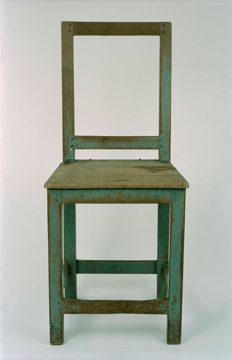 Stol av trä, blåmålad, sitsen svart (bortnött). Ramslå, fyrkantiga ben, ramformigt ryggstöd med vertikal ryggbricka (saknas). Under sitsen inbränt "I I S", samt med blyerts "far".