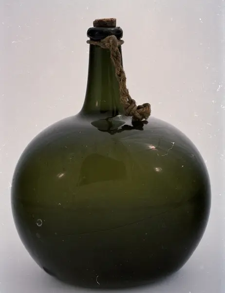 Flaska av grönt glas, klotformad med lätt tillplattade sidor, lång hals med droppskydd samt kork. Vid halsen knutet ett snöre, enligt huvudliggaren för flaskans upphängning.