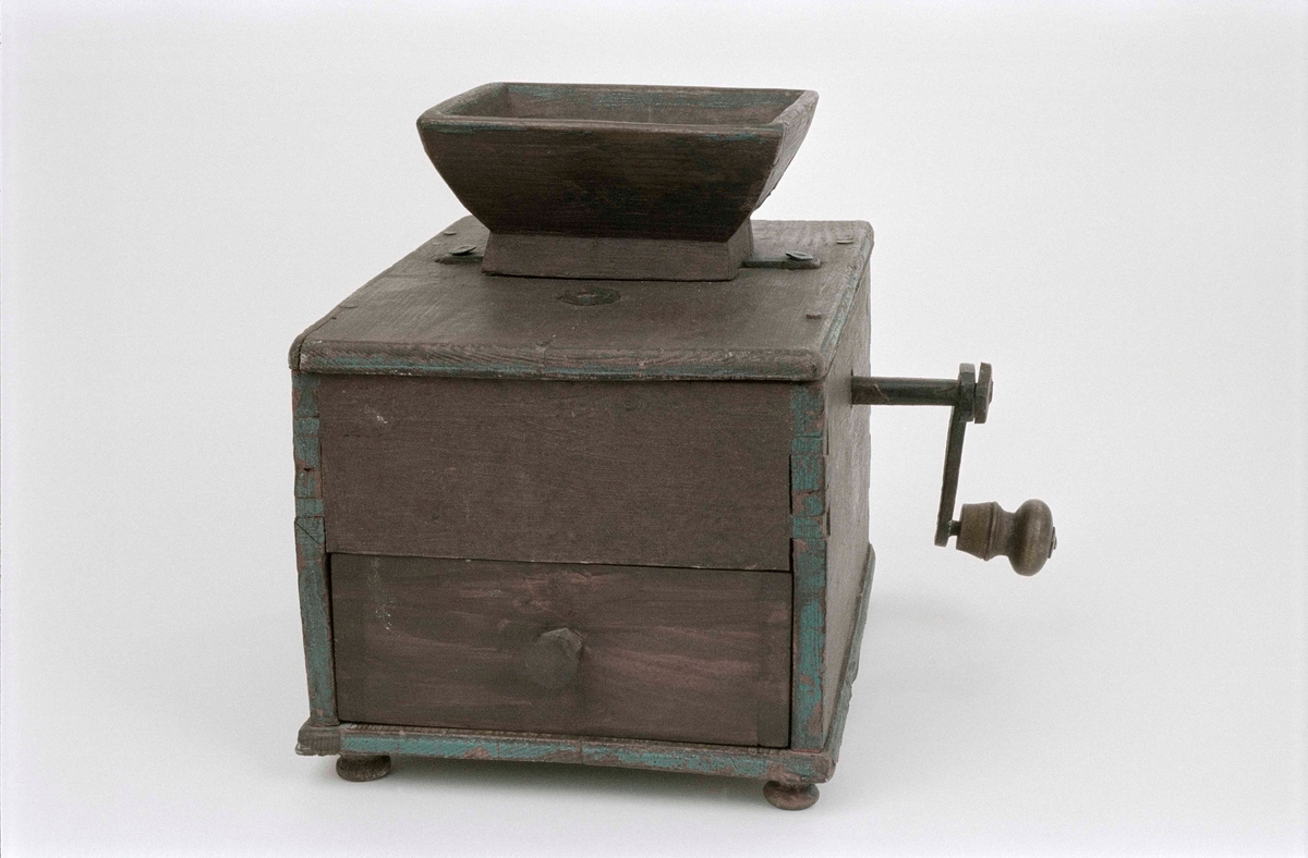 Kaffekvarn med hus och tratt av trä, valsformig krossare och vev av järn. Målad röd med blåa lister. Fyra kulformiga fötter, varav två nya. Nytillverkad låda.