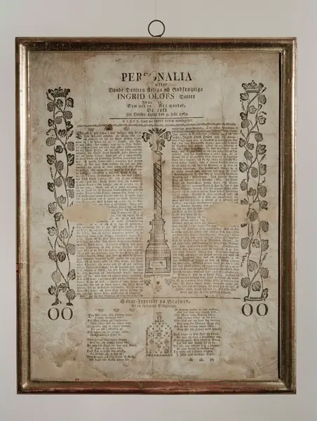 Historisk händelse, namn med anknytning till objektet: Olofsdotter, Ingrid, Historisk händelse, person, ort med anknytning till föremålet: null