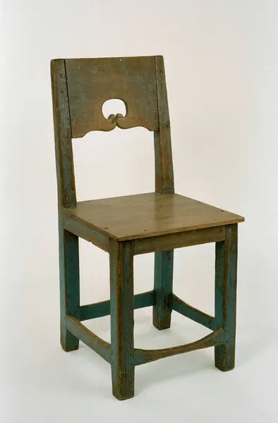 • Stol av furu, blåmålad, tappkonstruktion. Liggande rektangulär ryggbricka, genombruten dekor. Fyrsidiga ben, ramslå.